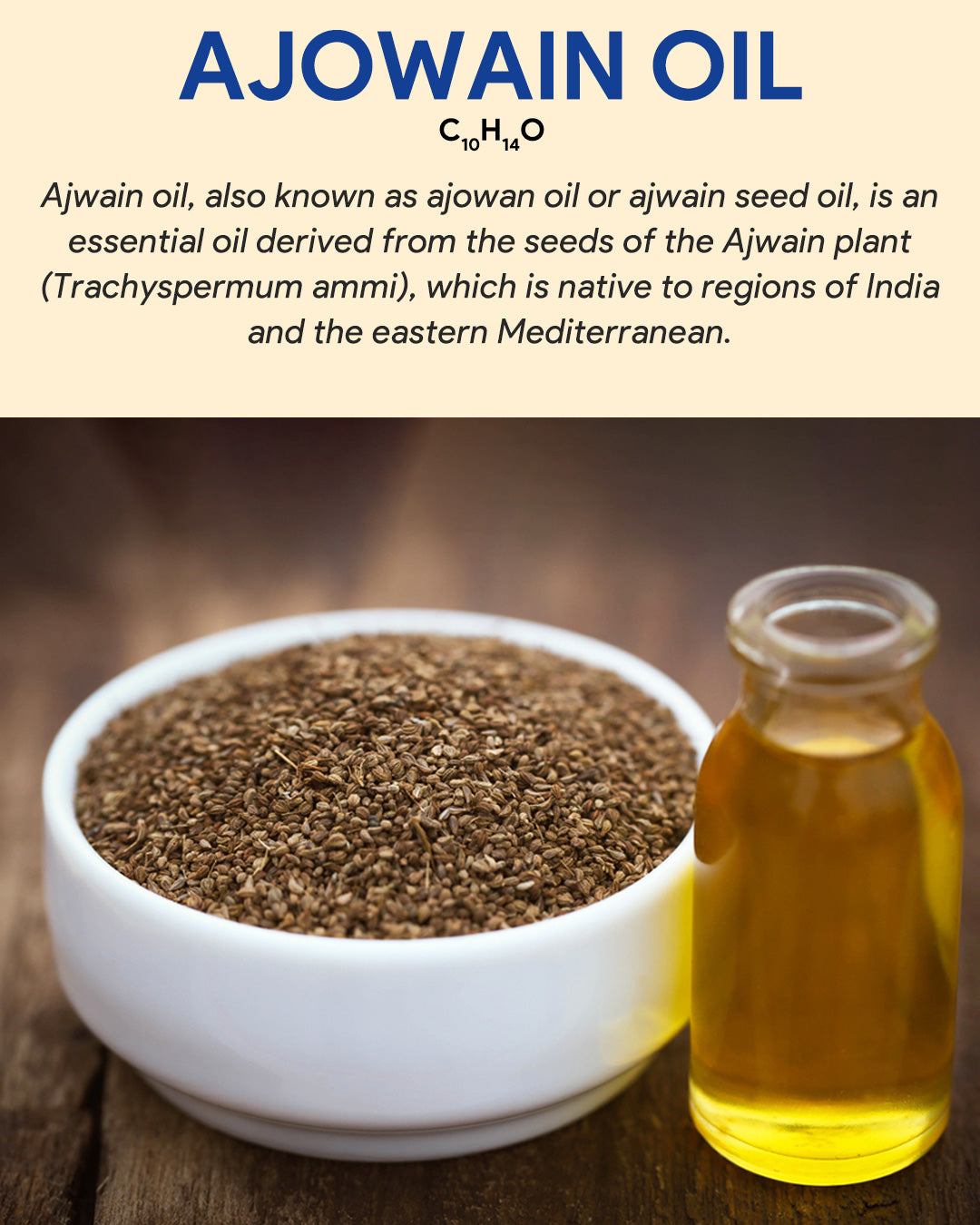 Ajwain oil, extracted from ajwain seeds, is renowned for its pungent aroma and therapeutic properties. It finds use in aromatherapy, traditional medicine, and culinary applications.