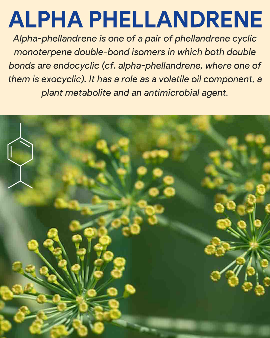 Alpha Phellandrene is a natural organic compound found in plants like eucalyptus and mint. It has a minty, citrusy aroma and is known for its potential health benefits.