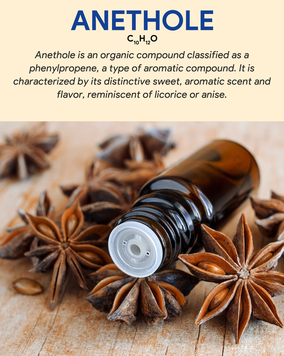 Anethole is a natural aromatic compound with a characteristic sweet, licorice-like scent. It's commonly used in the food and beverage industry as a flavoring agent, particularly in products such as licorice candies, beverages, and certain alcoholic drinks.