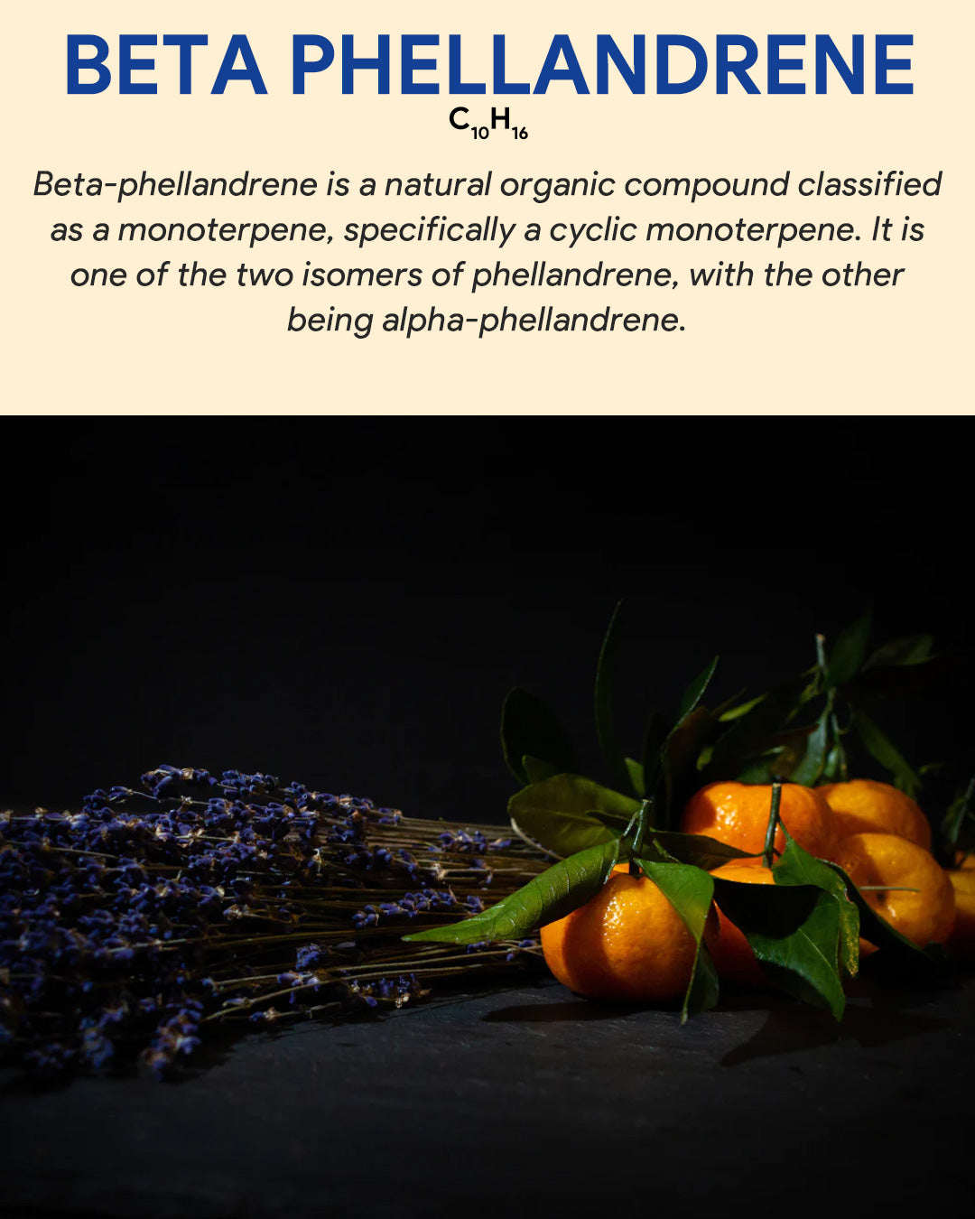 Beta Phellandrene is a natural monoterpene with a minty, eucalyptus-like aroma found in plants such as eucalyptus and peppermint. It's commonly used in the fragrance industry for its fresh scent and in aromatherapy for its potential respiratory benefits.