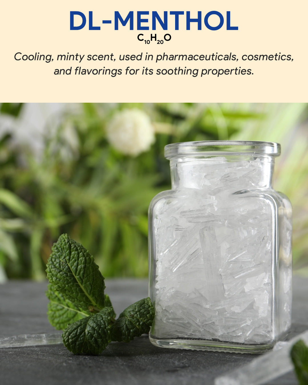 DL-Menthol is a natural organic compound with a cooling, minty aroma. It's commonly derived from peppermint and other mint oils and is used in the pharmaceutical industry for its analgesic and cooling properties, particularly in topical pain relief products.