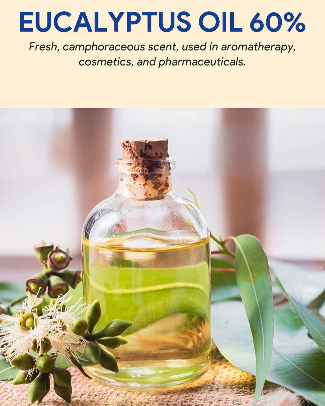 Eucalyptus Oil 60% is an essential oil derived from eucalyptus leaves, containing 60% eucalyptus oil and other components. It exhibits a strong, medicinal aroma and is commonly used in aromatherapy, as well as in topical preparations for its potential respiratory benefits.