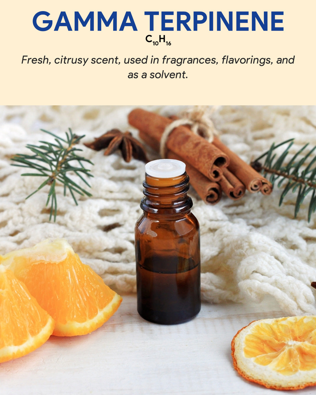 Gamma Terpinene is a natural organic compound with a citrusy, pine-like aroma. It's commonly found in essential oils of citrus fruits and is utilized in the fragrance industry for its fresh scent, as well as in cleaning products for its potential antimicrobial properties.