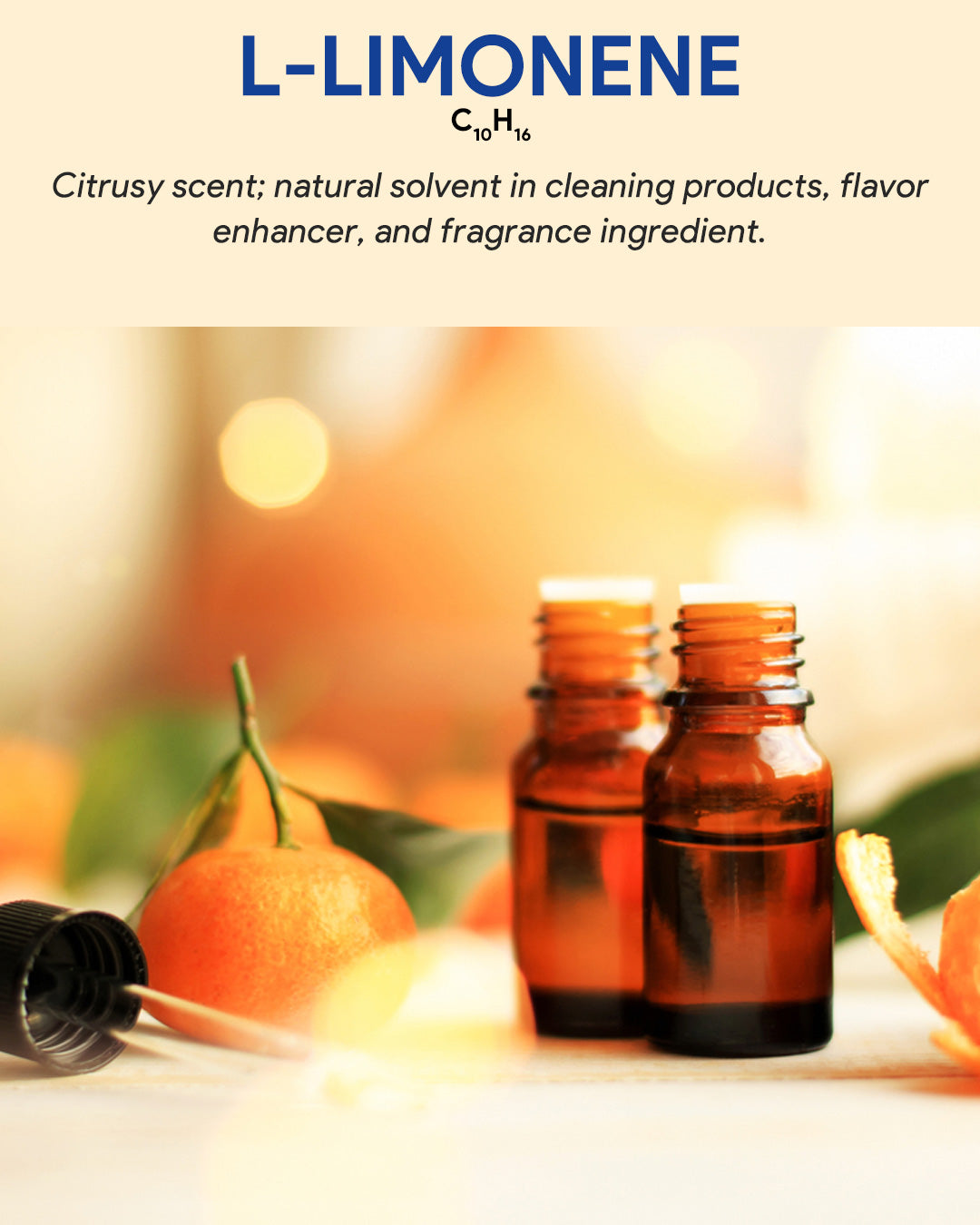 L-Limonene is a natural organic compound with a citrusy, lemon-like aroma. It's commonly found in citrus fruits and their essential oils and is used in the fragrance industry for its uplifting scent and as a solvent in cleaning products.