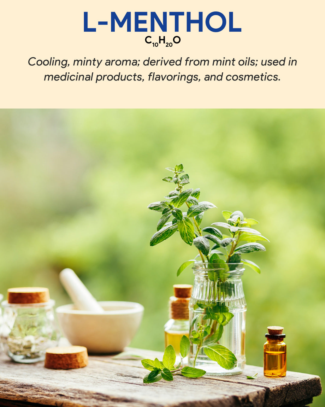 L-Menthol is a natural organic compound with a cooling, minty aroma similar to peppermint. It's commonly found in mint oils and is used in pharmaceuticals, oral care products, and personal care items for its refreshing sensation and potential therapeutic properties.