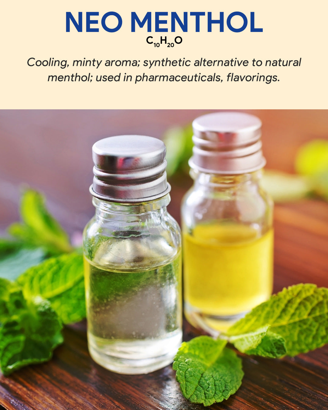 Neo Menthol is a synthetic organic compound with a cooling, minty aroma reminiscent of natural menthol. It's commonly used in pharmaceuticals, oral care products, and personal care items for its refreshing sensation and potential therapeutic properties.