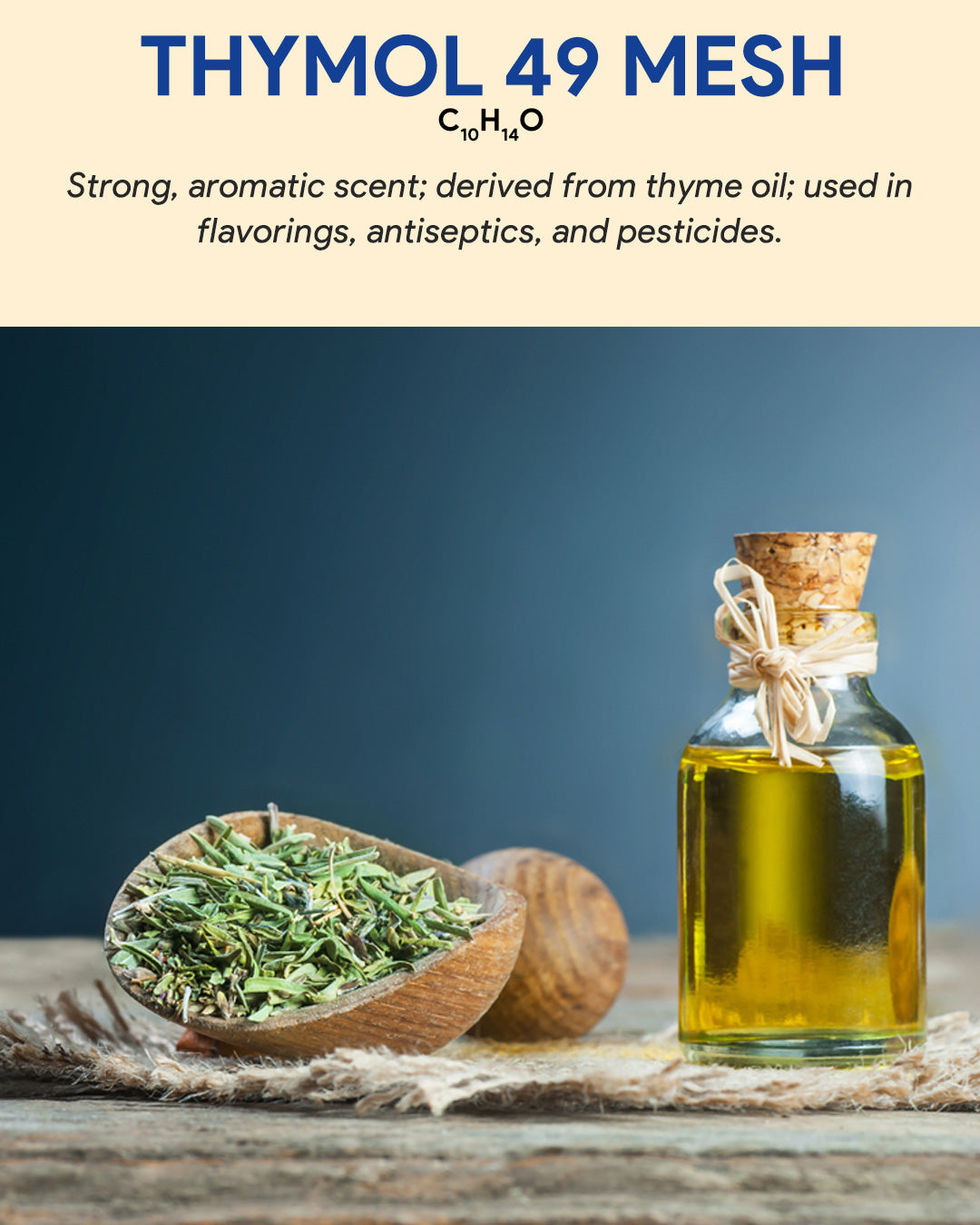 Thymol 49 Mesh is a fine crystalline powder derived from thyme oil, offering a strong, aromatic odor. It's commonly used in the pharmaceutical and food industries for its antimicrobial properties and as a flavoring agent.